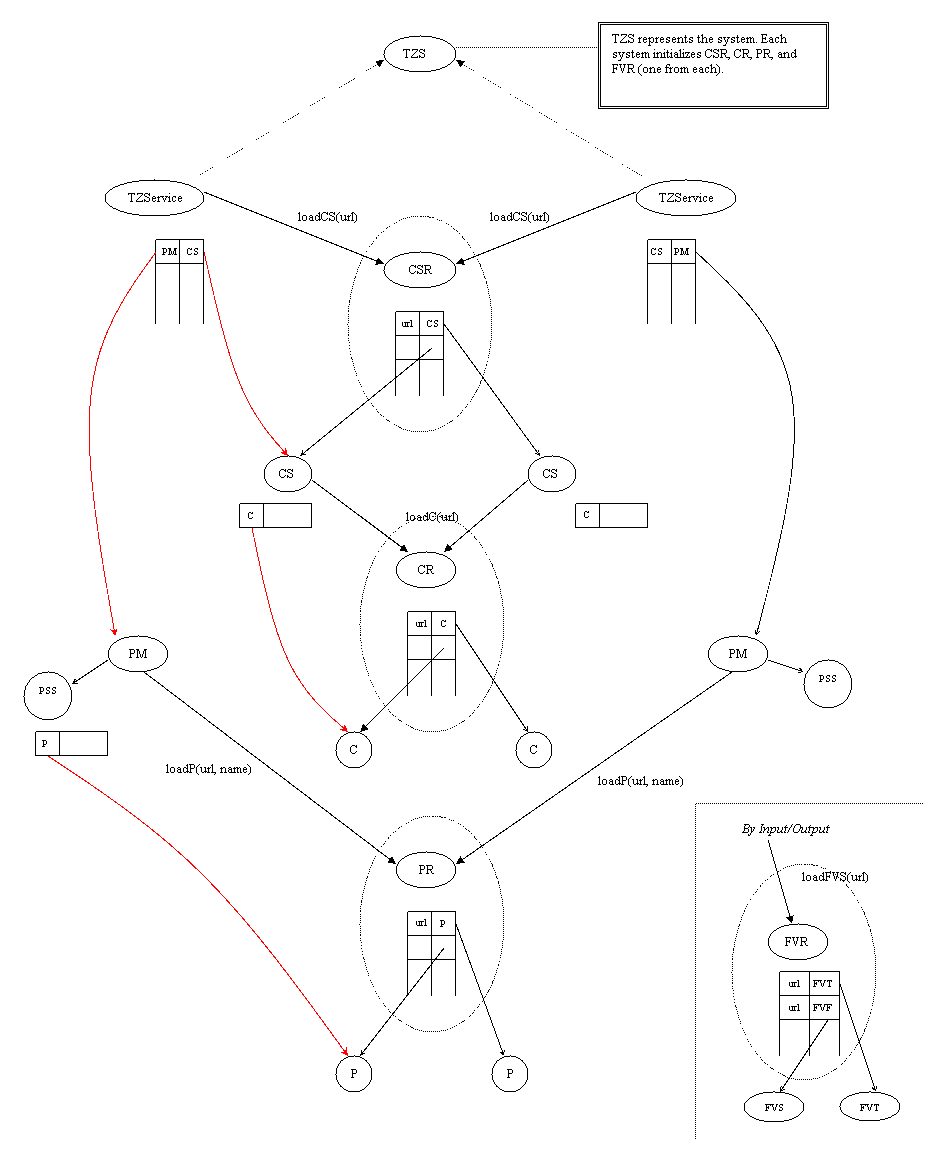 The only problem seems is garbage collecting. Now (concentrating on red lines) if a user removes its TZS, by distributed garbage collection (of JAVA RMI) we get rid of TZS and also all red lines. However, still there are black lines, which pointing to what red lines pointing. That means we can't use JVM's garbage collector. We might employ our garbage collector (a low priority thread, runs once in a while) checking references we impose on objects. However, we can't impose references on objects, since, for example, a user may push same Property twice, and we increment its referenceCount twice, which is not right (we have to get user identity -session ID-, which we wanted to get rid of).